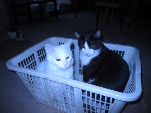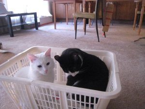 [實際是: 小白白也愛這個阿貓藍子 所以有時候會進去 可是這個胖 不知道爲什麼竟然也跑進去湊熱鬧 我看到的時候 胖已經被angel打了一巴掌了] the truth is: Angel loves this basket. She will take rest inside of it. Latte usually not goes into that basket. When I saw him and Angel were there, he was slapped by Angel already.
